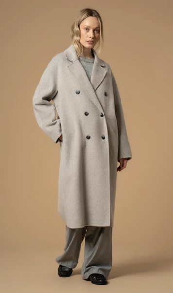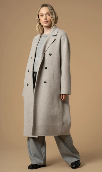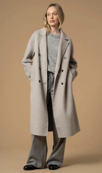Abrigo doble faz cruzado con solapa y dos filas de botones.