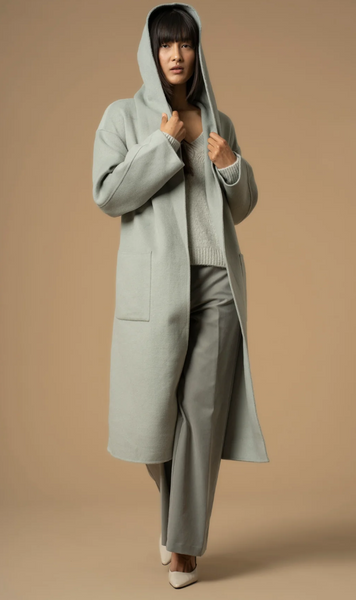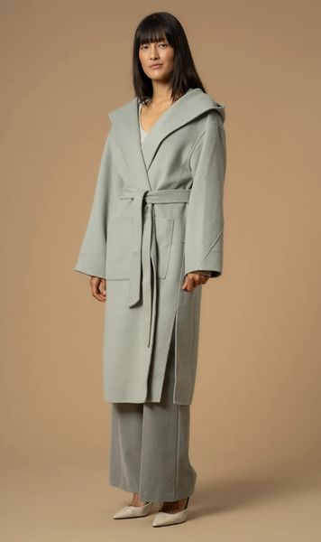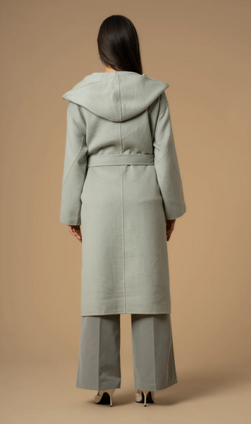 Abrigo doble faz con capucha y cierre con cinturón estilo batín en color verde menta.