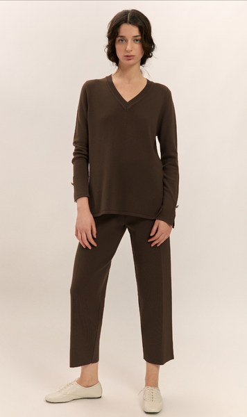 Pantalón recto tobillero en punto marrón chocolate con goma en la cintura.