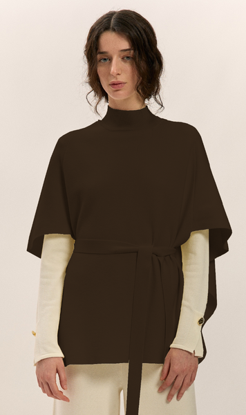 Poncho de cuello cisne, abierto por los laterales y con cinturón en punto marrón chocolate.