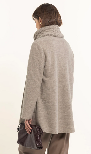 Chaquetón evasé en lana cocida gris con detalle de cuello de punto trenzado al tono.