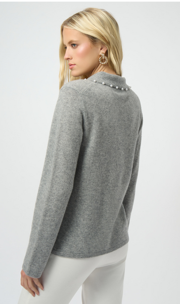 Suéter estilo polo de cashmere en tono gris claro con detalle de perlitas en el cuello.