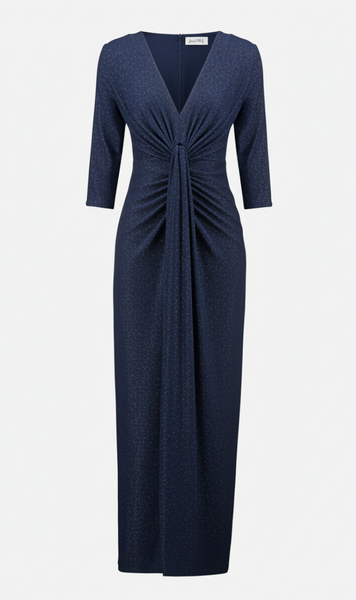 Vestido de noche, largo en lúrex azul marino. Escote en V con detalle drapeado en el frente y manga francesa.