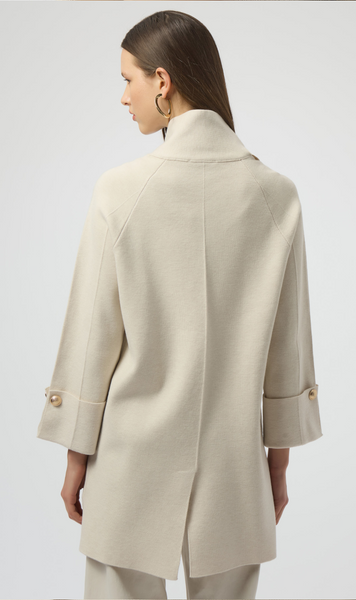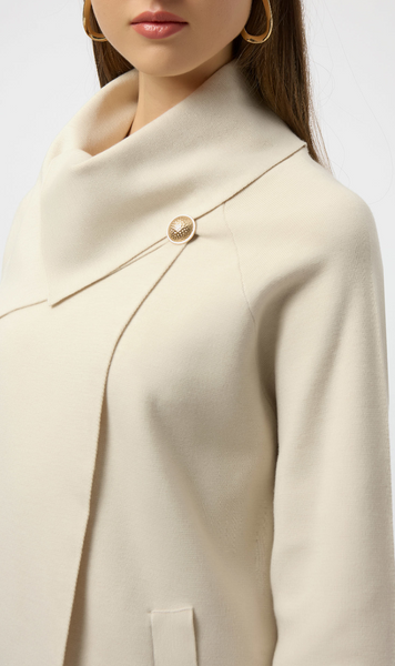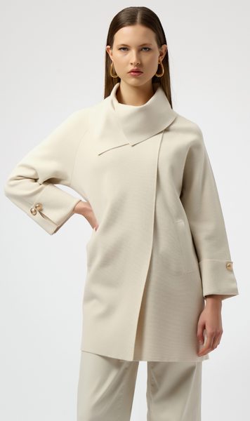 Abrigo corto en punto color crudo, manga larga y cierre cruzado con botón metálico y cuello chimenea.