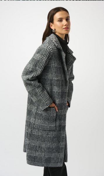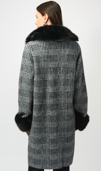 Abrigo de punto en cuadro de gales blanco y negro con puños y cuello de eco-pelo negro desmontables.