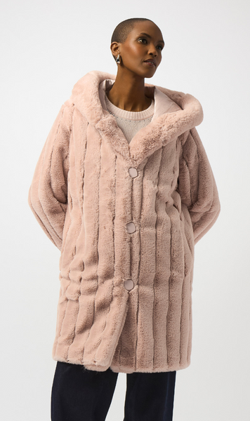 Abrigo rosa en eco-pelo a franjas verticales con capucha. Reversible con gabardina.