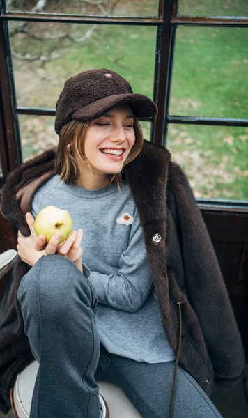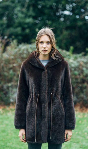 Chaquetón en eco-pelo imitando visón marrón oscuro. Con capucha y cordón ajustable en cintura.