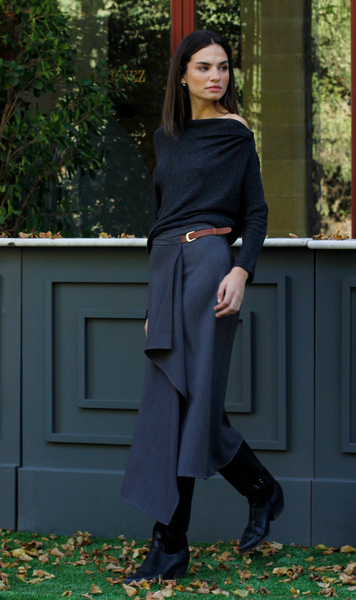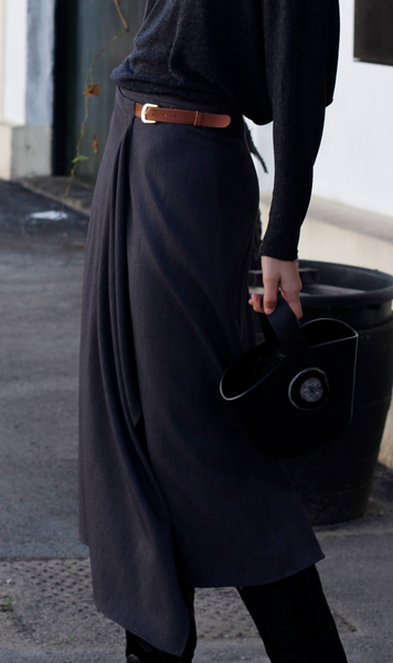 Falda envolvente en paño gris con detalle asimétrico en el frente y cierre con tira de cuero y hebilla.