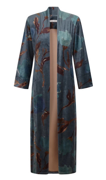 Levita de terciopelo estampado en tonos azul petróleo y marrones.