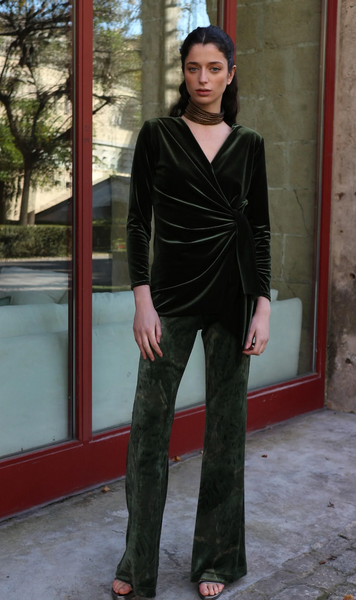 Pantalón palazzo en terciopelo estampado en tonos verdes.