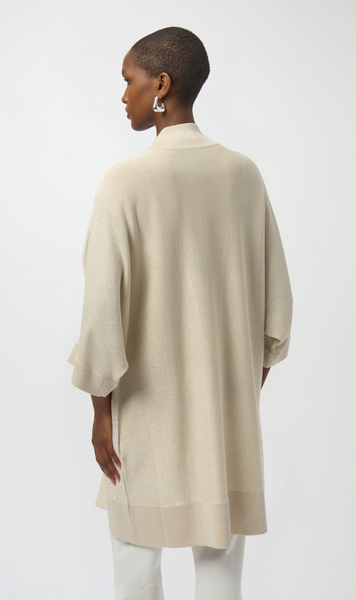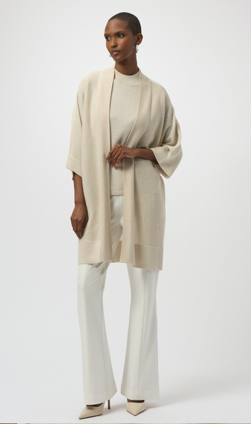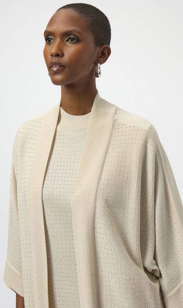 Cuerpo sin mangas con aplicaciones metálicas y chaqueta larga estilo kimono con manga francesa.