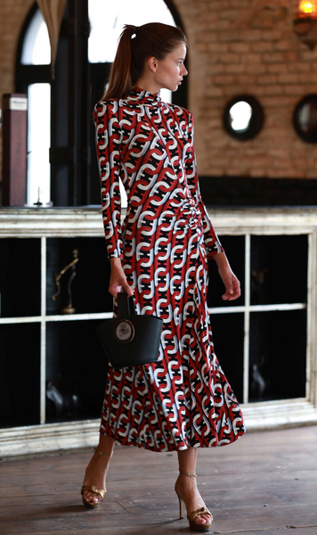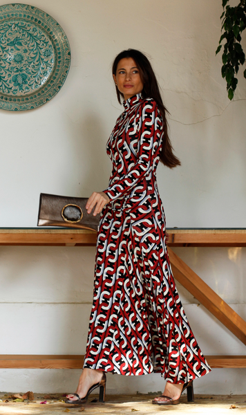 Vestido largo en punto estampado en rojo, blanco y negro. Cuello alto, manga larga, fruncido delantero y falda con vuelo.